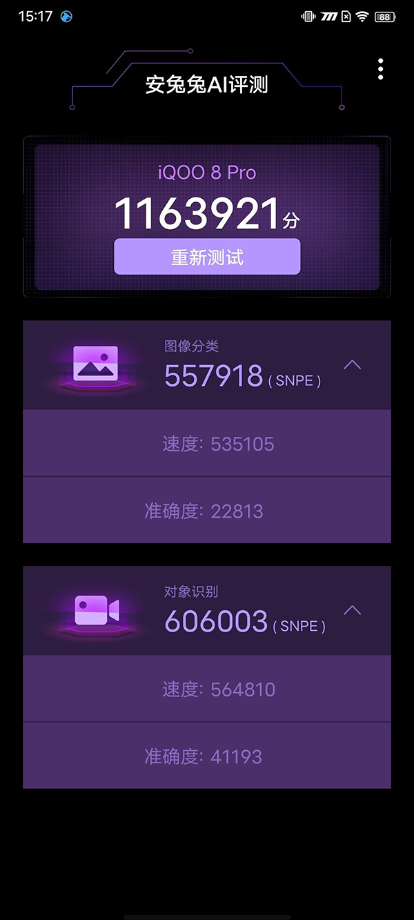 我們通過安兔兔AI評測作為測試應(yīng)用,這個應(yīng)用大家應(yīng)該都不陌生了。iQOO 8 Pro搭載的驍龍888 Plus最終測試成績?yōu)?163921分,比起之前驍龍888普遍得到的912709分要高出不少。