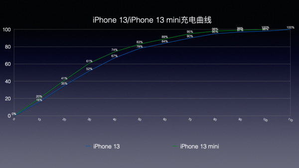 電池續(xù)航這對于廣大iPhone用戶,尤其是mini的用戶們來說,無疑是極具吸引力的。iPhone 13全系的機身內部都經過了重新設計,為的就是盡可能塞入更大的電池,根據官方資料顯示,iPhone 13 mini和iPhone 13均支持Qi無線充電以及最高20W的有線充電,續(xù)航時間相比上代分別提升了1.5和2.5個小時。同時,我們也在使用了蘋果官方20W充電頭,并關閉了手機設置中“優(yōu)化電池充電”功能的場景下,對iPhone 13 mini和iPhone 13的續(xù)航以及充電速度進行了實測。