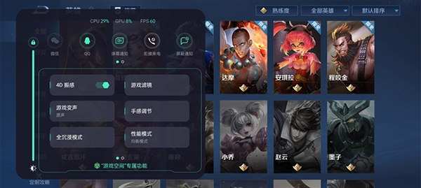 并且內(nèi)置的游戲空間,有性能模式、智能調(diào)節(jié)分別率、亮度鎖定、閃電啟動(dòng)、4D振感等功能選擇,可以根據(jù)游戲需求來(lái)開(kāi)啟相關(guān)功能。