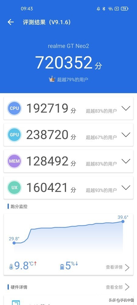 為了更好地給大家展示搭載驍龍870的真我GT Neo2的性能,我們用安兔兔跑分進(jìn)行了簡(jiǎn)單的測(cè)試,輕松跑出了720352分的成績(jī),性能是無(wú)需擔(dān)憂的。具體來(lái)看,CPU跑分192719分,GPU跑分23872分,MEM跑分128492分,UX跑分160421分。