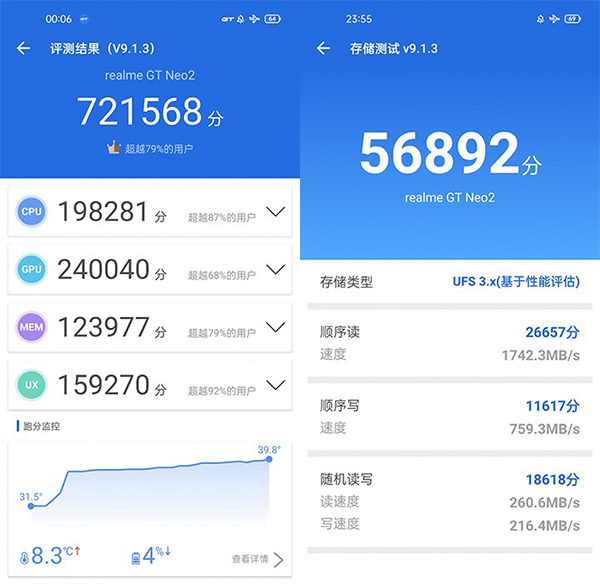 實(shí)測(cè)常溫下開啟GT模式,真我GT Neo2的安兔兔跑分可達(dá)721568分,存儲(chǔ)測(cè)試中順序讀取非常優(yōu)秀,超過(guò)1700MB/s,而順序?qū)懭?、隨機(jī)讀寫則是平均水平,符合驍龍870檔位中高端手機(jī)的性能。