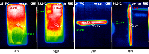 在該散熱模式下,上述游戲,半小時(shí)《和平精英》,正面最高溫度36℃,背部最高溫度33.5℃,手掌握持的頂部30.4℃,底部30.8℃,左右邊框在31℃左右。