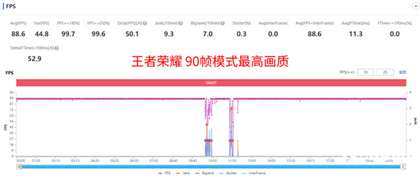 游戲幀率實測部分,筆者全程開啟GT模式+高性能游戲優(yōu)化。王者榮耀90幀最高畫質(zhì),兩局游戲幾乎全程90幀,除了極個別的大規(guī)模團戰(zhàn)有細微波動,游戲過程中幀率沒有低于過85幀,非??煽糠€(wěn)定。