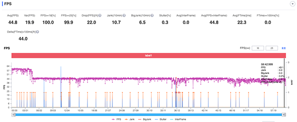 而在「性能黑洞」——《原神》(極高畫質(zhì)+60Hz)上,真我GT Neo2的幀率則先是在滿幀60FPS上跑了大約3分鐘,隨后則是穩(wěn)定在45FPS左右,最后整體的平均幀率為44.8FPS。