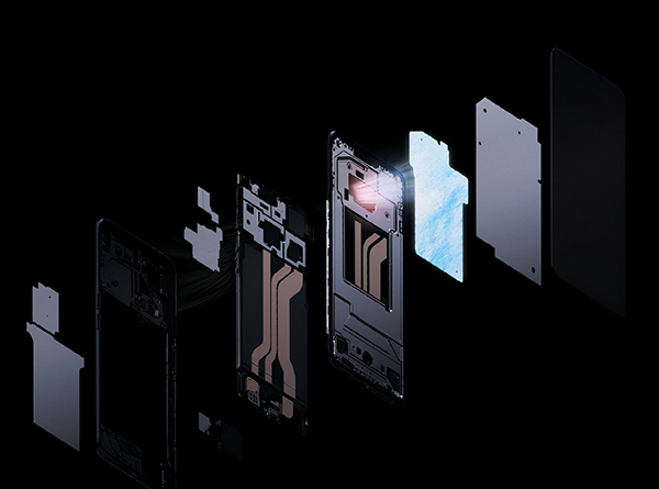 這個8層式立體散熱結(jié)構(gòu)從上至下分別是石墨片、VC、金剛石凝膠、銅箔(上層)、凝膠、硅膠片、銅箔(下層)、石墨烯,將熱量快速傳遞出來,做到了全方位散熱無死角。