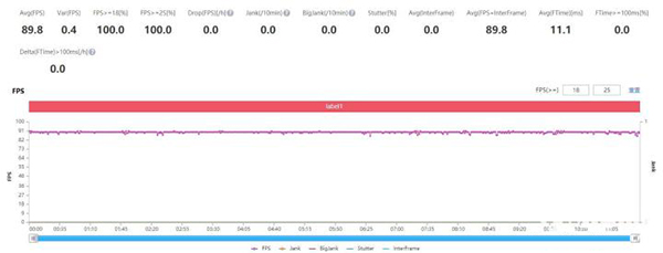 國民游戲《王者榮耀》中支持90幀極限幀率模式,我們參照官方給出的數(shù)據(jù),使用“超高幀率+超高分辨率+高清畫質(zhì)”的設(shè)定進(jìn)行測試,一局游戲全程90幀運(yùn)行完全無卡頓、無掉幀。在一局游戲過后,手機(jī)正面最高溫度36.2度,背面最高溫度35.7度,手感上非常舒適,這種游戲體驗顯然要超過不少旗艦機(jī)型。