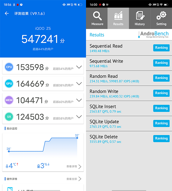 理論性能方面,iQOO Z5的安兔兔跑分為55萬+,相比iQOO Z3提升了近12%,讀寫速度方面的數(shù)據(jù)為1490MB/s,相比起上一代同樣有大幅度提升。