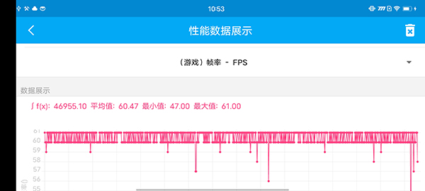 游戲?qū)崪y環(huán)節(jié),第一款游戲是對性能要求不高的《王者榮耀》,在畫質(zhì)選項(xiàng)調(diào)至全高的情況下,iQOO Z5的表現(xiàn)極為穩(wěn)定,平均幀率為60.47幀,最低幀率為47幀。
