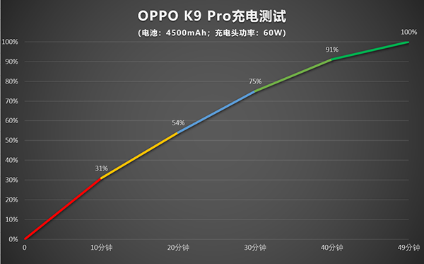 經(jīng)過測試,在耗盡電量自動關機后開始充電測試,10分鐘就能達到31%的電量,30分鐘達到75%的電量,達到100%電量用時49分鐘。這樣的充電速度也讓碎片化充電變得更有實際意義,平??臻e充電幾分鐘也能獲得不少電量。這樣的回血速度讓你不管是臨時出門還是課間充電,片刻之間就能給你滿滿的安全感,續(xù)航從此不再焦慮。