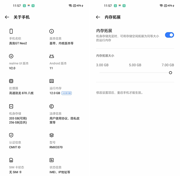 在性能方面,真我GT Neo2采用了比較穩(wěn)定的驍龍870處理器,屬于旗艦級芯片,性能也是目前頂尖之列,CPU大核提升到3.2Ghz,相比驍龍888,其性能發(fā)揮會更加穩(wěn)定,尤其在長時間的高負載(游戲)場景下,性能優(yōu)勢更為突出。所入手的真我GT Neo2是12GB+256GB版本,UFS3.1閃存規(guī)格,并可支持3GB、5GB、7GB等不同內(nèi)存大小擴展。