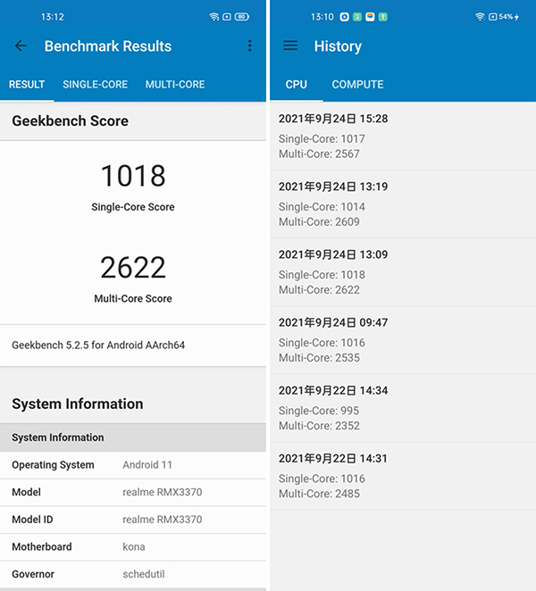 在GeekBench5.2軟件測試中,真我GT Neo2的單核分數(shù)為1018,多核分數(shù)為2622分,單核性能較為強悍,但是多核性能相比其它驍龍870手機有些偏弱,多次測量之后,分數(shù)相差不大。