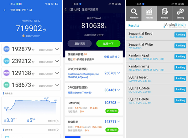 為此,我們又使用了通用的安兔兔以及魯大師兩款軟件進行了性能評測,最終安兔兔獲得719902分,魯大師獲得了810638分,與其它驍龍870處理器的手機性能大致相同。在Androbench的存儲性能測試中,順序讀取速度為1764.24MB/s,順序?qū)懭胨俣葹?69.06MB/s,達到了UFS3.1水準。
