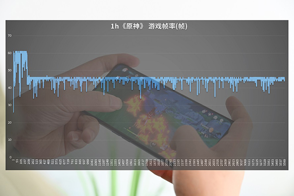 而配置相對(duì)較高的《原神》游戲體驗(yàn)中,將圖像質(zhì)量均開(kāi)啟最高,游戲幀率調(diào)整至60,進(jìn)行1小時(shí)高強(qiáng)度測(cè)試,通過(guò)FPS幀率記錄,發(fā)現(xiàn)前3-4分鐘,游戲會(huì)以60幀率滿幀運(yùn)行,隨后幀率出現(xiàn)急速下滑至45,之后便一直以45幀率穩(wěn)定運(yùn)行,可能是手機(jī)特殊的設(shè)定,最終游戲的平均幀率為45.54,雖然游戲未能以滿幀持續(xù)運(yùn)行,但是穩(wěn)定的連續(xù)FPS走勢(shì)已證明了其游戲的流暢。