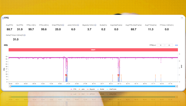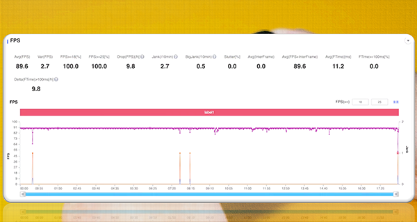 測試游戲20分鐘,全程沒有任何卡頓的感覺,平均幀率高達(dá)89.6FPS,基本貼著滿幀率線在跑。當(dāng)然,這個成績并不意外,大部分驍龍870的旗艦都能做到,并不能說明真我GT Neo2究竟有多穩(wěn)。
