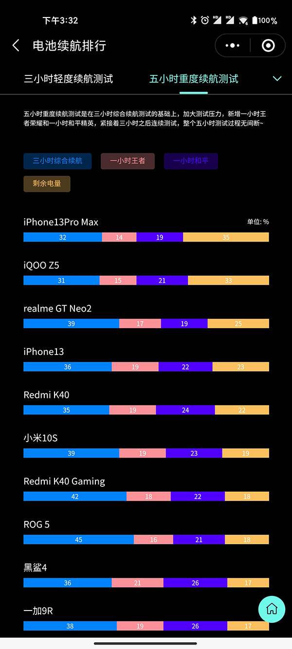 我自己使用情況的話,從早上7點(diǎn)出門到晚上8點(diǎn)回家,還有35%-40%的電量。當(dāng)然,我個人使用習(xí)慣不能說明問題,這里引用小白測評數(shù)據(jù)庫的測試數(shù)據(jù),真我GT Neo2經(jīng)過5小時的重度續(xù)航測試之后,續(xù)航表現(xiàn)排在所有手機(jī)當(dāng)中的第三位,續(xù)航依然夠“穩(wěn)”。