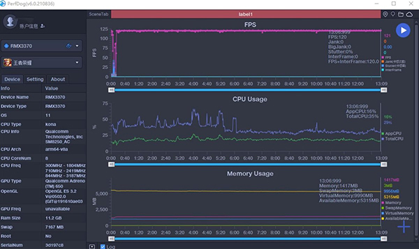 在開啟王者榮耀極高幀率(120幀)+超高分辨率+高清畫質(zhì)的設(shè)定下,我們開始了游戲,并通過PerfDog幀率測試軟件對realme真我GT Neo2的游戲幀率進行了測試。