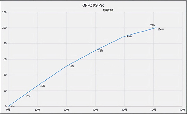 首先看看OPPO K9 Pro的充電能力測試,從下列充電曲線上可以看到,這款手機(jī)在20分鐘可以從0充至51%,40分鐘可以充至89%,充滿則需要50分鐘左右,此外整個(gè)充電過程并不會(huì)感到明顯發(fā)熱。對于上班族而言,就算晚上忘記充電,早上起床洗漱期間充一小段時(shí)間,基本技能滿足一天的續(xù)航需求了。而且這個(gè)充滿電量時(shí)間也與發(fā)布會(huì)上所說的46—50分鐘充滿相吻合,所以在充電實(shí)力方面,OPPO K9 Pro是沒有任何噱頭可言的,這個(gè)充電表現(xiàn)在同價(jià)位中已經(jīng)是非常不錯(cuò)的了!