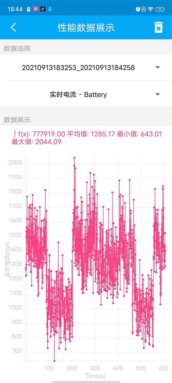 開啟優(yōu)化功耗之后,數(shù)據(jù)似乎更離譜了,平均電流1285.17mA,最大電流低了一些,只有2044.09mA,最小電流來到了643.01mA。