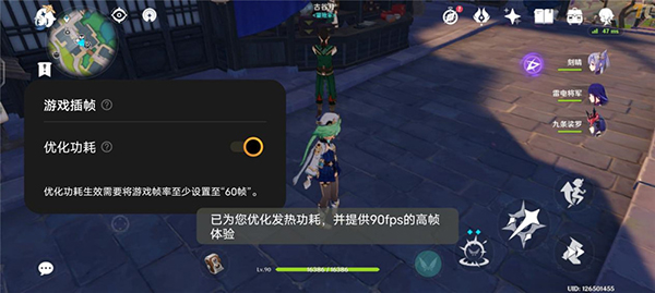 這不免讓我們想到,手機沒有提供游戲插幀的開關(guān),并不是我們想的那樣默認支持游戲插幀,而是暫時還不支持游戲插幀?而在游戲插幀選項下,有“優(yōu)化功耗”這一選項,開啟之后將會提供“90幀體驗”,為此我們開啟這一功能再來進行驗證。