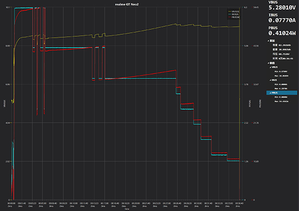 在充電開始之后,realme真我GT Neo2大約需要20秒左右的時間進行快充協(xié)議的識別和握手,隨后逐漸增加充電功率。在3分30秒左右,realme真我GT Neo2的充電達到最大功率54W左右。充電5分20秒左右后充電功率出現(xiàn)第一次退坡,從54W降低至43W。15分鐘~27分鐘區(qū)間的平均充電功率大約是33W,從整個功率記錄上來看realme的這個快充功率設定還是比較激進的。