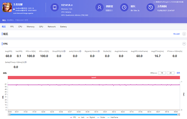 在游戲實測環(huán)節(jié)中,我選擇了《王者榮耀》來測試iQOO 8 Pro的性能表現。在游戲運行過程中,這款手機的運行表現十分流暢,即便是在多人團戰(zhàn)的游戲場景中也沒有出現明顯的卡頓情況。在下面的實測幀率圖中可以看到,它在游戲過程中做到了全程無明顯掉幀,整體幀率表現穩(wěn)定,這點十分難得。