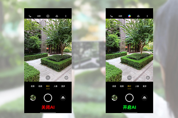 在拍照界面的頂部,有一個AI標(biāo)識,這是AI場景增強(qiáng)功能,打開與關(guān)閉有明顯區(qū)別。通過下面一組對比可以看出,打開AI場景增強(qiáng)之后,景物的色彩飽和度和畫幅亮度增高,整體通透性也有所提升。