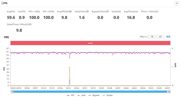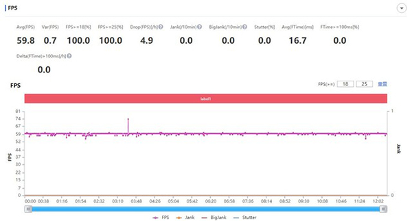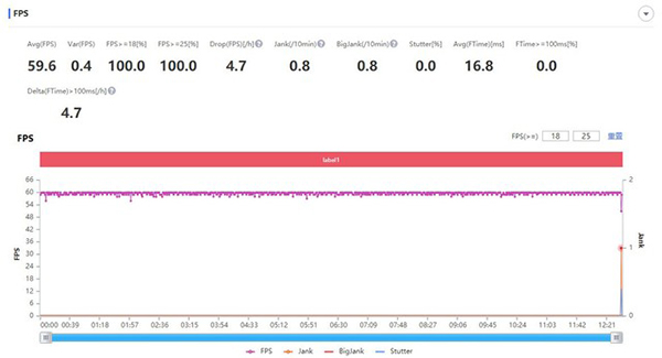 首先依然是iPhone 12 Pro Max,我們通過幀率曲線圖不難發(fā)現(xiàn),在游戲過程中幀率僅有一處較大的波動,除此之外幀率表現(xiàn)還是非常優(yōu)秀的,平均幀率為59.5幀。在游戲過程中,出現(xiàn)了少許的卡頓,但整體表現(xiàn)在意料之內(nèi)。