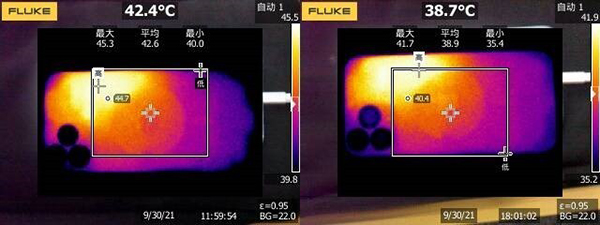 經(jīng)過30分鐘游戲測試后,兩款手機的背板溫度逐漸發(fā)生差異,iPhone 12 Pro Max在游戲后的溫度為42.4℃而iPhone 13 Pro Max的背板溫度為38.7℃,很顯然后者在溫度控制上是更加優(yōu)秀的。