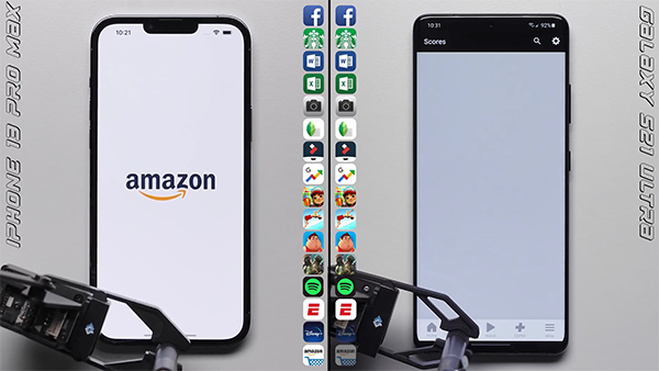 第一輪iPhone 13 Pro Max和三星S21 Ultra軟件打開分別耗時為1分鐘51秒、1分鐘58秒,第二輪iPhone 13 Pro Max和三星S21 Ultra的軟件打開耗時分別為47秒和49秒。