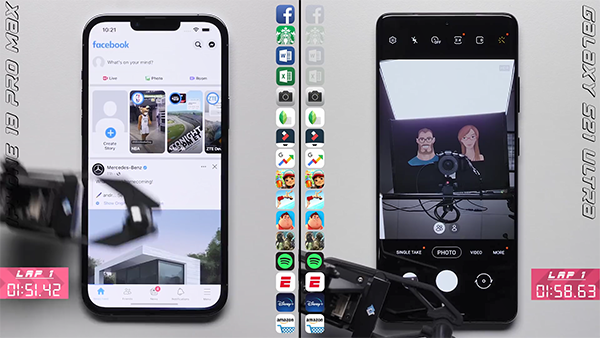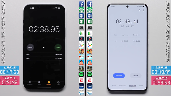 iPhone 13 Pro Max兩輪共耗時為2分38秒,三星S21 Ultra兩輪共耗時2分48秒,iPhone 13 Pro Max比三星S21 Ultra少同時10秒。