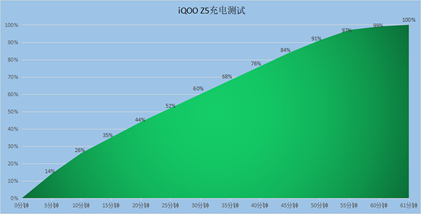 持久的續(xù)航表現(xiàn)必須有先進(jìn)的快充技術(shù)與之匹配,不然再出色的續(xù)航體驗(yàn)也會(huì)大打折扣。因此,iQOO Z5在擁有5000mAh大電池的基礎(chǔ)上,還配備了44W閃充技術(shù),當(dāng)手機(jī)電量用盡時(shí),可以在短時(shí)間內(nèi)做到快速回血,保證用戶用機(jī)體驗(yàn)的持久。根據(jù)實(shí)測(cè),iQOO Z5在電量用盡的情況下,僅需10分鐘就能往手機(jī)中充入26%的電量,30分鐘充電60%,至快僅需61分鐘就能將5000mAh大電池充至100%。44W閃充技術(shù)不僅讓體驗(yàn)錦上添花,還拉開了iQOO Z5與其他競(jìng)品的差距,形成差異化賣點(diǎn)。