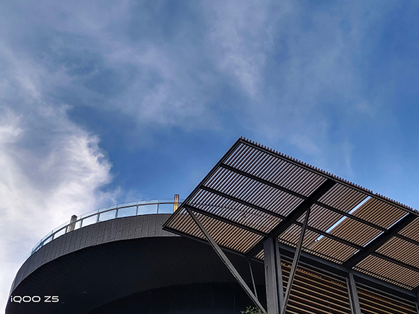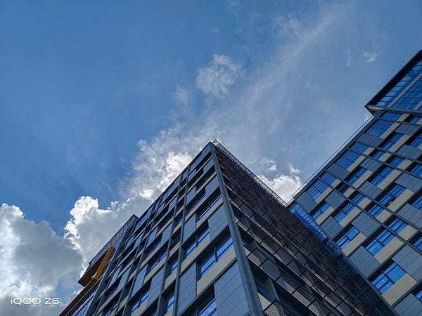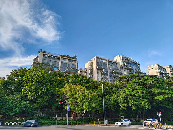 光線良好環(huán)境下,iQOO Z5對三星GW3的調教還是很成熟的,放大之后畫面解析力、邊緣畫質優(yōu)化、白平衡處理都不錯,建筑樓體經過銳化處理,看起來比較硬朗。
