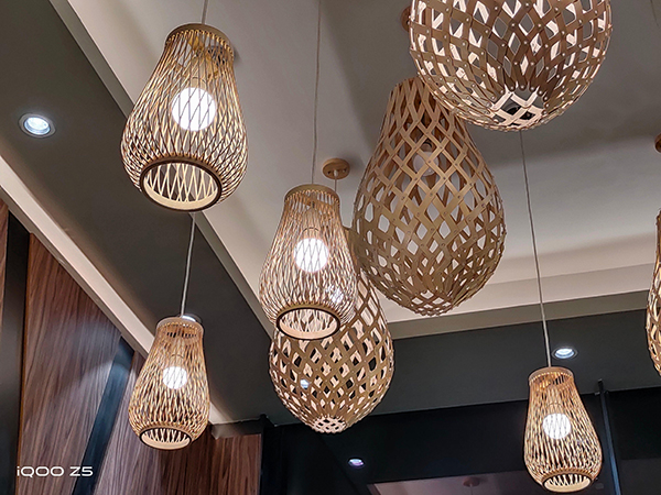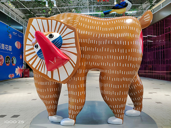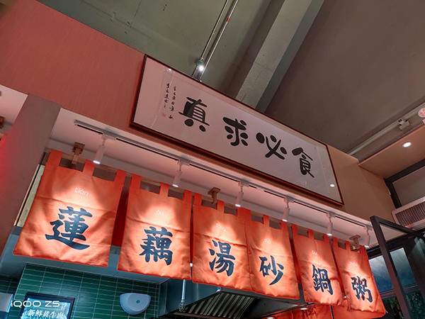 室內日光燈環(huán)境下,iQOO Z5對燈具輪廓、字體顏色、大型玩偶的紋理細節(jié)、色彩還原比較精致,但高光壓制效果欠缺火候,圖中蓮、藕紅色招牌上白色小字已經看不清,日光燈看起來模糊一片,多少有點影響視覺觀感。