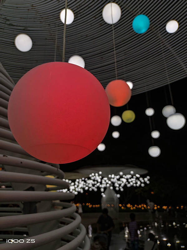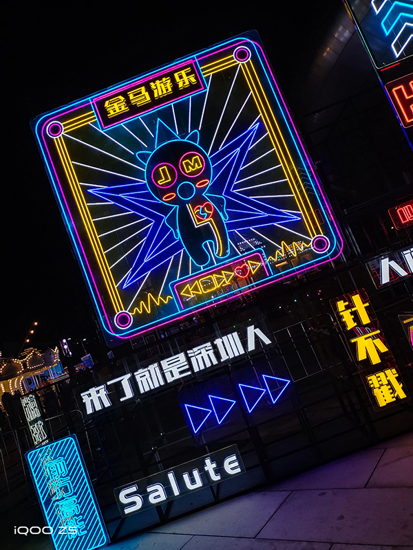 紅色球體背景虛化控制得不錯,金馬游樂霓虹燈色彩分明,暗光環(huán)境景色、建筑拍攝成像效果不錯。美中不足的是,暗部細節(jié)經不起放大,面對強光源時星型的燈體和背后白色牌坊高光壓制還需要進一步優(yōu)化。