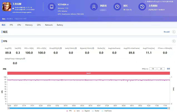 《王者榮耀》測(cè)試時(shí),我選擇的是“超高幀率+超高分辨率+高清畫(huà)質(zhì)”。幀率監(jiān)測(cè)數(shù)據(jù)顯示,iQOO Z5的平均幀率達(dá)到89.8幀,十二分鐘零五秒的游戲?qū)种?,iQOO Z5毫無(wú)大幅度掉幀的跡象,只是在團(tuán)戰(zhàn)時(shí)會(huì)出現(xiàn)1至7幀的小幅畫(huà)面波動(dòng)情況。毫不客氣地說(shuō),iQOO Z5的《王者榮耀》表現(xiàn)已經(jīng)比肩定價(jià)更高的頂級(jí)游戲旗艦。