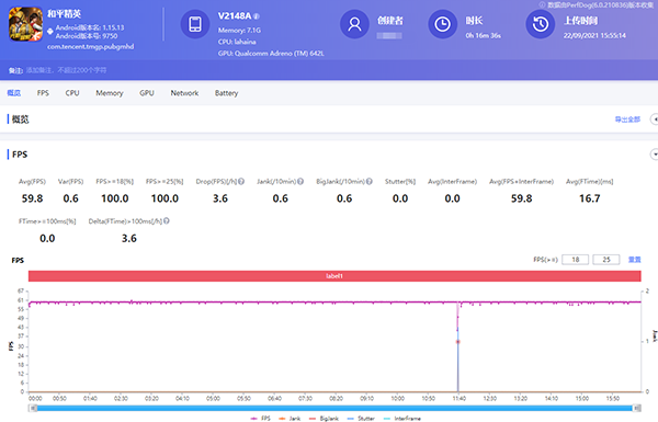 《和平精英》測(cè)試時(shí),我選擇的是“超高”幀數(shù)和“流暢”畫(huà)面品質(zhì),游戲時(shí)長(zhǎng)為16分鐘36秒。iQOO Z5的整體表現(xiàn)依然不錯(cuò),游戲全程僅出現(xiàn)一次大幅掉幀情況,幀率下降至40幀,其他時(shí)刻幀率始終保持在59-60之間,堪稱(chēng)滿幀吃雞。