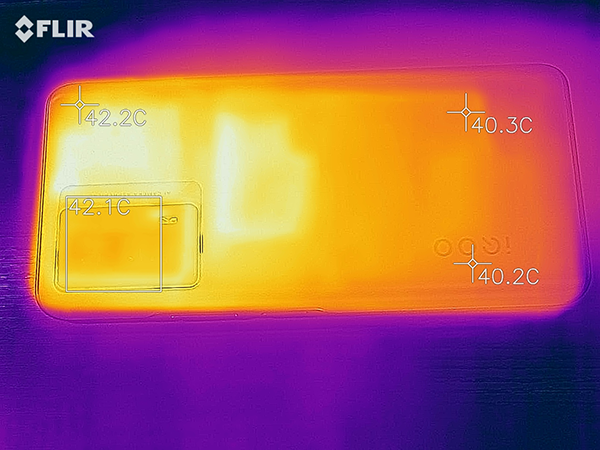 由于連續(xù)體驗(yàn)游戲,iQOO Z5的機(jī)身溫度上升明顯,相機(jī)模組部分溫度已經(jīng)達(dá)到42.1℃,后蓋最高溫度則達(dá)到42.2℃。但是對(duì)比驍龍888 Plus機(jī)型的吃雞溫度,iQOO Z5的表現(xiàn)還是挺不錯(cuò)的。
