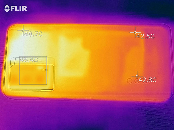 核心負(fù)載增加,發(fā)熱必定更嚴(yán)重,測(cè)試數(shù)據(jù)顯示,機(jī)身背部最高溫度已經(jīng)達(dá)到46.7℃。所以,還是不要用《原神》折磨iQOO Z5了,溫度升高自己也會(huì)玩得不舒服。