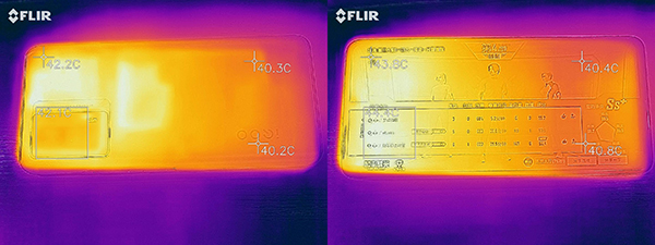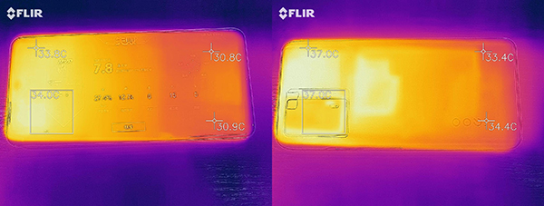 具體到相應的游戲場景中,13分鐘《王者榮耀》機身正面最高溫度34.0℃,背部最高溫度37.0℃;16分鐘《和平精英》機身正面最高溫度44.4℃,背部最高溫度42.2℃;16分鐘《原神》機身正面最高溫度47.5℃,背部最高溫度46.7℃。