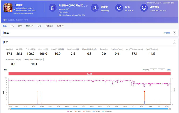 Find X3 Pro在《王者榮耀》90幀模式下的表現(xiàn),特效全開未做任何優(yōu)化未開啟性能模式,游戲時長約12分鐘,具體實(shí)測成績?nèi)缦拢?