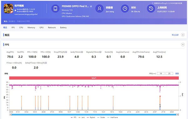 需要注意的是,當(dāng)測試完畢后《王者榮耀》立即進(jìn)入《和平精英》進(jìn)行實(shí)測采用90幀模式,游戲時長約30分鐘,在該模式下,平均幀率為79.6fps,平均每十分鐘卡頓次數(shù)為4.0,平均每十分鐘卡頓次數(shù)為0.3。
