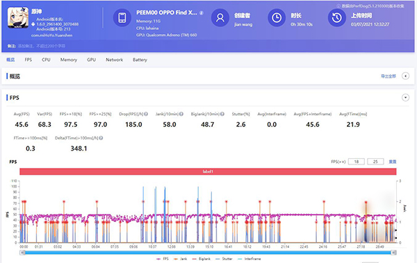 原神這款游戲可以說是目前旗艦手機(jī)的夢魘,還沒有一款手機(jī)能夠滿幀運(yùn)行,F(xiàn)ind X3 Pro在30分鐘左右的游戲時長內(nèi)表現(xiàn)不錯,具體成績?nèi)缦拢?