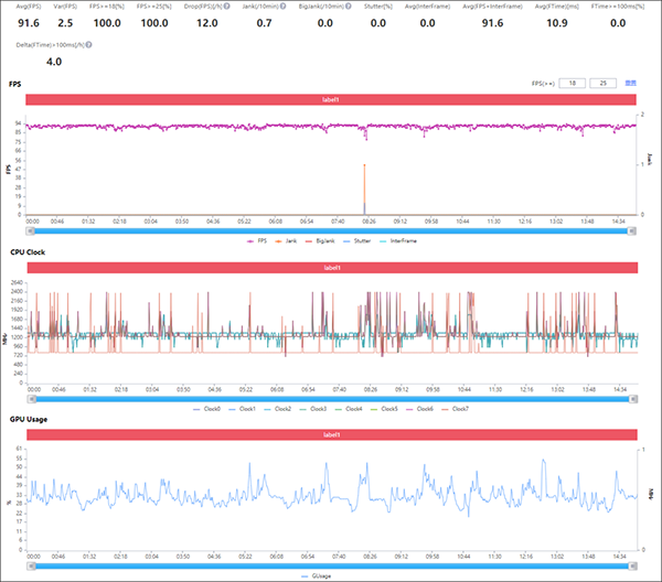 首先是「王者榮耀」,先將畫面設(shè)置為最高的顯示幀率(90fps),同時(shí)分辨率也調(diào)節(jié)到「超高」的水平,畫面總質(zhì)量選擇「高清」,并開啟抗鋸齒和陰影效果;15分鐘的游戲里,Nova9 Pro的表現(xiàn)挺穩(wěn)定,平均幀率能達(dá)到91.6fps,已經(jīng)頂上最高的幀率了;CPU的表現(xiàn)也比較穩(wěn)定,并不會出現(xiàn)突然降頻率來緩解散熱能力的情況。