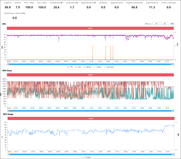 接著是「和平精英」,為了讓Nova9 Pro的性能得到更大的發(fā)揮空間,我們使用了工具對游戲的幀率進(jìn)行了破解,且把畫質(zhì)開啟到HDR高清,并開啟抗鋸齒和陰影效果,同時(shí)將幀率調(diào)到90fps等級。整個(gè)23分鐘的游戲平均幀率為88.8fps,幀率的表現(xiàn)比較穩(wěn)定,前面的16分鐘能頂著最高的90fps跑,但16分鐘后出現(xiàn)了小范圍、短暫的幀率下降,不過基本不影響實(shí)際畫面——重要的是游戲過程中CPU沒有降頻。