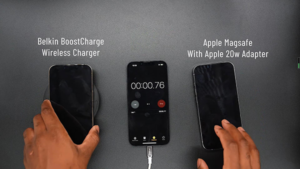 無線測試采用的是20W蘋果快充插頭和蘋果Magsafe組合,與貝爾金的15W無線快充組合的無線充電速度對比。采用的測試機(jī)型是iPhone 13 Pro,由于蘋果Magsafe支持磁吸式的無線快充,所以可以很牢固的吸附在iPhone 13 Pro的機(jī)身背面,而貝爾金的15W無線快充則不支持磁吸式的吸附。