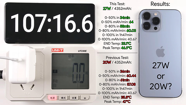 從測試結(jié)果來看,有線27W的快充和有線20W的快充,給iPhone 13 Pro Max電池充電完成所耗費(fèi)的時(shí)間均為1小時(shí)47分鐘,也就是說無論是27W的快充還是20W的快充,在充電速度上并沒有什么區(qū)別。不過在iPhone 13 Pro Max的充電過程中,機(jī)身的溫度還是有少許的區(qū)別。