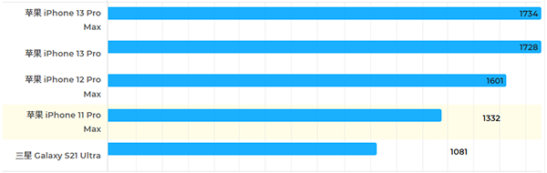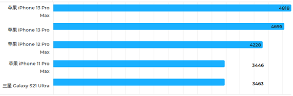 為了驗(yàn)證iPhone 13 Pro Max與其它機(jī)型的性能差異,我們將iPhone 13 Pro Max與iPhone 13Pro、iPhone 12 Pro Max、iPhone 11 Pro Max、三星Galaxy S21 Ultra進(jìn)行了測(cè)試對(duì)比。