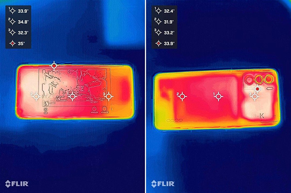 和平精英和穿越火線不間斷游戲半個小時后測試,正面最高溫度35°C,背面最高溫度也只是33.9°C。