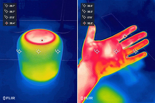 左圖是播放音樂的HomePod,頂部溫度為39.4°C。右圖是我的手,最高溫度為32.2°C。