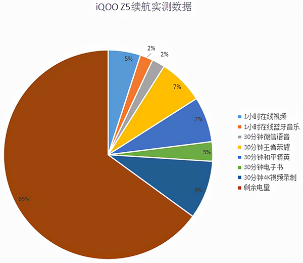 在整個測試過程中,iQOO Z5的表現(xiàn)給人帶來了很大的驚喜。在為手機充滿電量后,我使用iQOO Z5進行了包含玩游戲、看視頻在內(nèi)的一系列日常娛樂操作,發(fā)現(xiàn)它的大電池確實能滿足我這類重度手機用戶的用機要求。我使用它播放了60分鐘的在線視頻后,手機電量只消耗了5%;我使用它玩了30分鐘的《王者榮耀》后,手機也才掉了7%的電量,由此推算,這款手機的電量足以支持用戶玩游戲超過7個小時。不僅如此,我使用iQOO Z5錄制了30分鐘的4K 視頻,手機才消耗了9%的電量,這對于一些影像創(chuàng)作者來說也是相當友好的。而在經(jīng)過長達4.5個小時的測試后,手機還剩余65%的電量,可見該款機型的續(xù)航能力足以讓用戶擺脫電量焦慮。